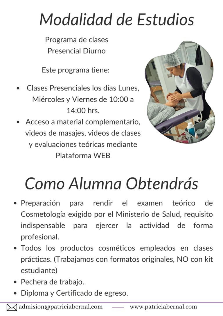 Para mayor información sobre Cosmetología llámanos al teléfono +56984286545 o escríbenos a admision@patriciabernal.com